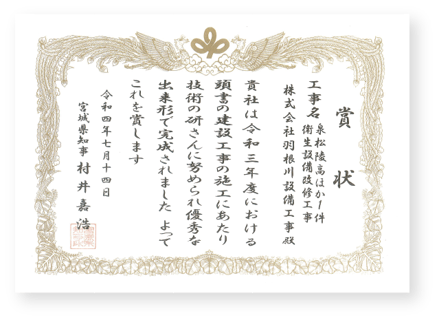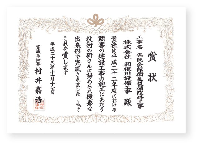 ・仙台市若林体育館受水槽設備災害復旧改修工事 ・仙台市鶴ヶ谷児童館災害復旧移転改築機械設備工事